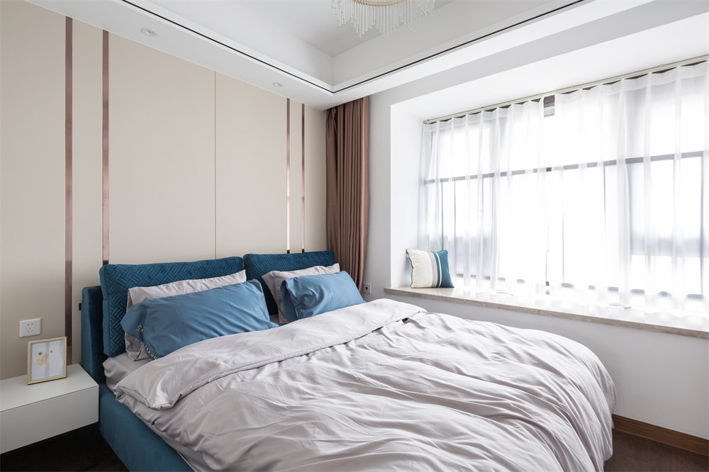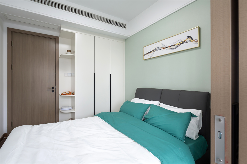 主臥室在沿用輕奢的風(fēng)格同時(shí)做了細(xì)微的調(diào)整,薄荷綠色的背景顯得清新又自然,仿佛如修剪草地后散發(fā)的清香。衣柜延伸出的轉(zhuǎn)角區(qū)域充分利用了衣柜旁的空間,可以隨手放置書(shū)本、眼鏡、收納籃。