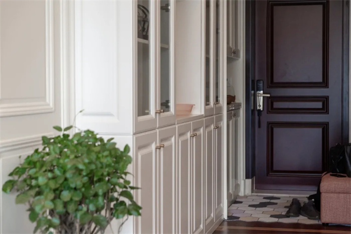 在進(jìn)門處打造了整面到頂?shù)男P(guān)柜,門的右側(cè)放置小巧的換鞋凳。芬蘭白的玄關(guān)柜搭配膜壓門板,展現(xiàn)出門板做工的精細(xì)和準(zhǔn)確。金色的立體把手適應(yīng)人體美學(xué)需求,在柜門關(guān)上時做了緩沖的設(shè)計,緩緩關(guān)上可減少噪音。中間鏤空部分安置了三到四個插座,給手機(jī)充電或者安上小夜燈,都是很方便的。