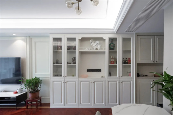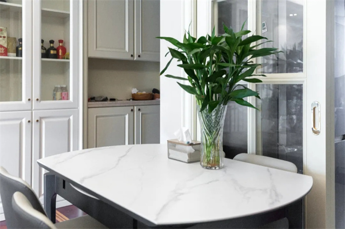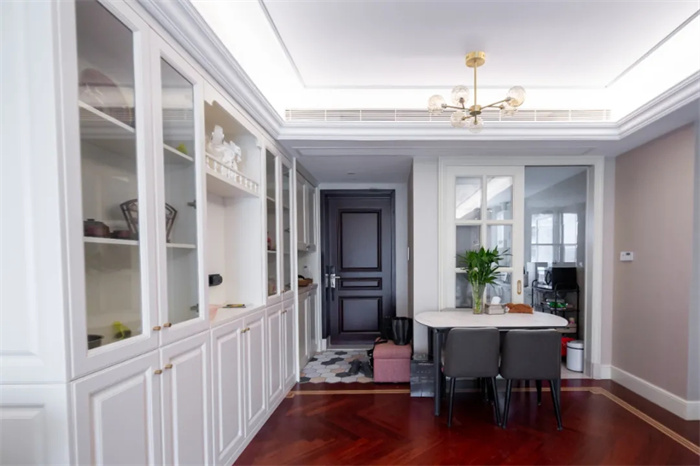 左側(cè)便是與玄關(guān)柜相連的餐邊柜,餐邊柜集酒柜、收納柜的功能于一體,最大限度發(fā)揮出產(chǎn)品的使用價值。芬蘭白的門板顏色與透亮的玻璃相搭配,不需要額外給物品增加神秘感,想要的東西拉開柜門便可以拿到。餐邊柜中間部分上方的圍欄設(shè)計,放置石膏雕像增加空間內(nèi)的藝術(shù)感。
