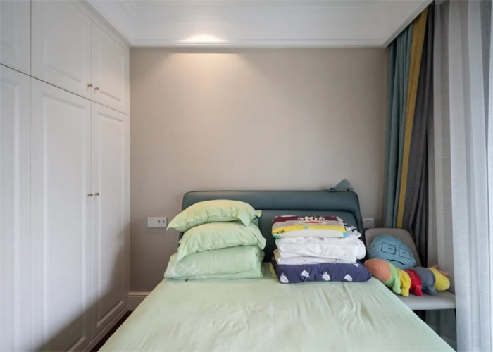 次臥與陽臺相連接,使得整體的光線更加透亮,實(shí)現(xiàn)了在早晨起來便能感受到來自外界的第一縷光亮。與主臥處顏色搭配相反,床鋪使用的是相應(yīng)的淡綠色,背景墻采用的是棕色。