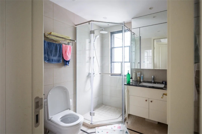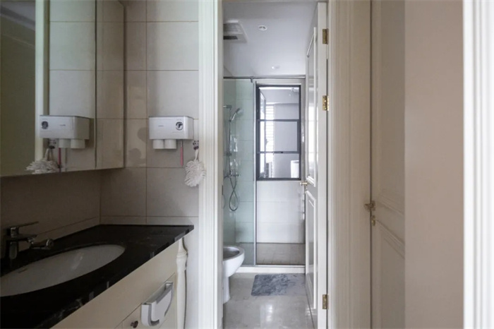 此處衛(wèi)浴間位于書房和儲物間的中間,透光性略微有些不充足。從衛(wèi)浴柜到馬桶到淋浴間三者按照順序有序打造, 使用起來相對方便。