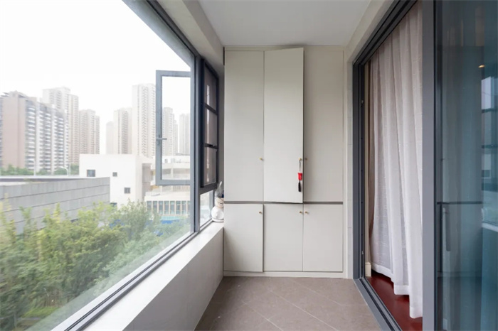 整個陽臺具有一定的長度,在另一側(cè)打造成多功能儲物區(qū)。門板顏色光澤度高,手感溫和,耐磨損耐用,在陽臺處改造成為休閑區(qū),放上桌椅板凳。眺望窗外即可獲得片刻的休閑。