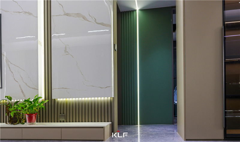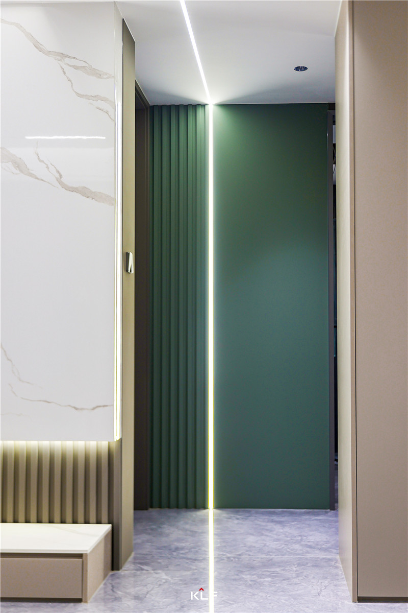 例如在過道處的格柵護(hù)墻板采用了客來?!け逃竦念伾?,清新自然,凸顯質(zhì)感。而在臥室中則采用了更為深沉的灰色系不規(guī)則格柵墻板,營造平靜高級的家居氛圍。