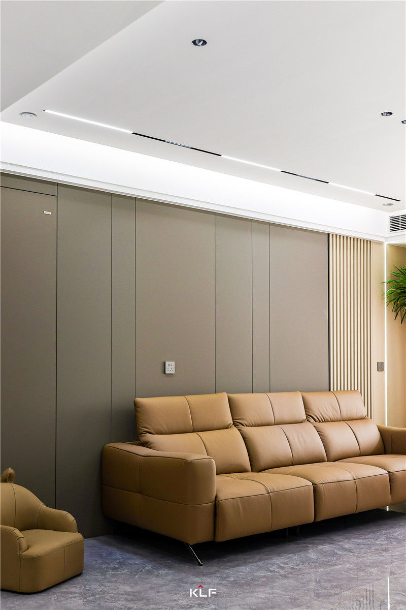 沙發(fā)背景墻也采用了布魯灰平板造型護(hù)墻板與芬蘭白豎向格柵拼接的設(shè)計(jì),灰白撞色簡約淡雅,強(qiáng)化了整體空間的細(xì)節(jié)與質(zhì)感。垂直的線條更加能刻畫出木作柔和的美感,強(qiáng)調(diào)整齊等距的韻律感,并巧妙地結(jié)合光影、綠植,勾勒藝術(shù)空間。