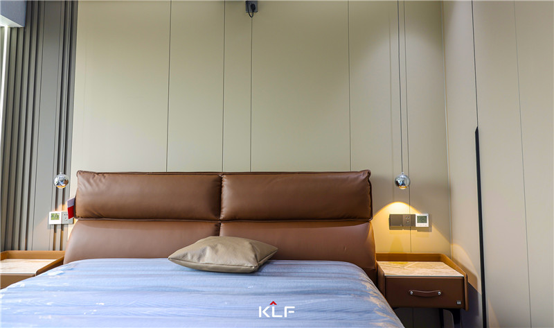 將格柵作為空間肌理進(jìn)行使用,與拉槽墻板一同設(shè)計(jì),實(shí)現(xiàn)門墻柜同色,豐富平面讓整體空間從視覺上更統(tǒng)一美觀。臥室衣柜依據(jù)墻壁走勢定制,根據(jù)不同衣物收納需求設(shè)計(jì)分區(qū),讓衣柜更懂人居。
