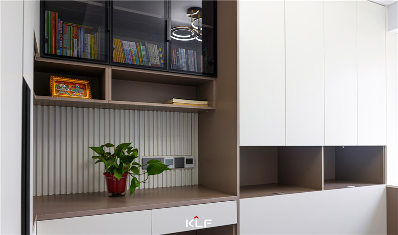 客廳的沙發(fā)背景墻處有一處隱藏暗門,隱藏的小次臥組合起衣柜與書柜,為家人提供更完善的生活功能區(qū)。