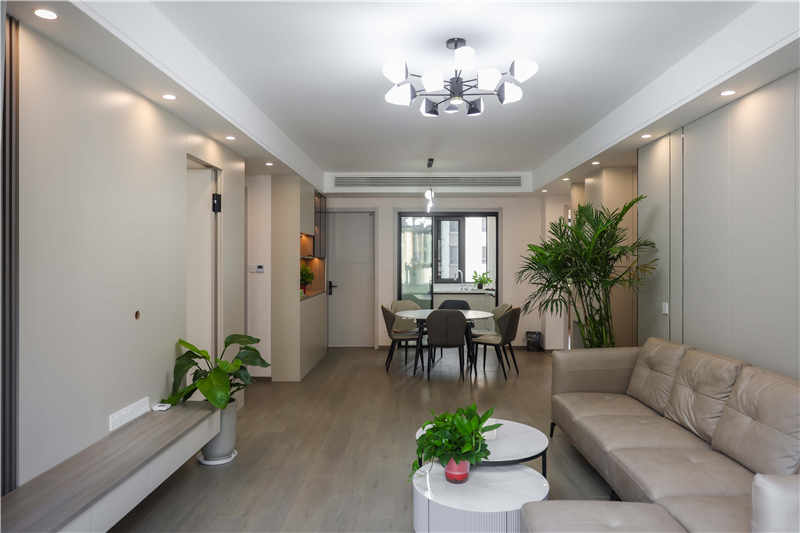 在整體設計上,這套案例選用了茶白的主色調,以灰咖色、黑色等做輔助,打造簡約的空間感,再以金屬、玻璃等進行裝飾,在流暢的家居線條下打造一個輕奢風的精致家。