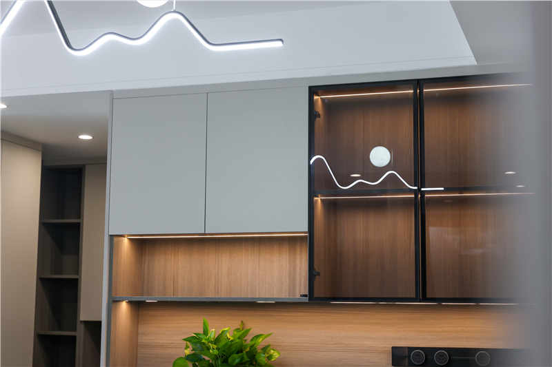 在餐廳與衛(wèi)生間的區(qū)域間以一組隔斷柜去進行空間美化,穿插的設計手法以抽屜分隔整個高柜,整體尺寸更加協(xié)調,中部加入長虹玻璃的設計可以搭配綠植或是手辦擺件,整體會更精致。