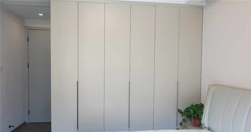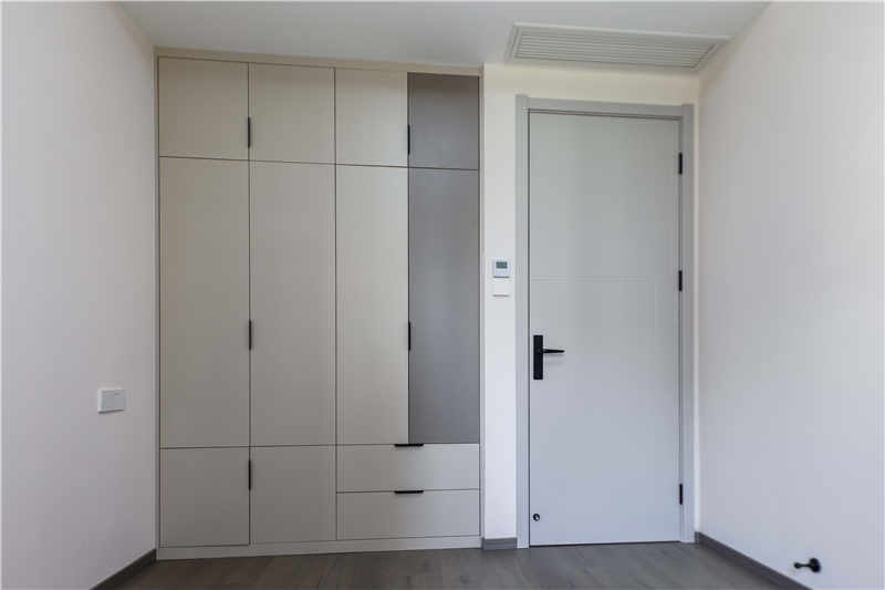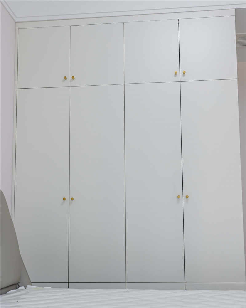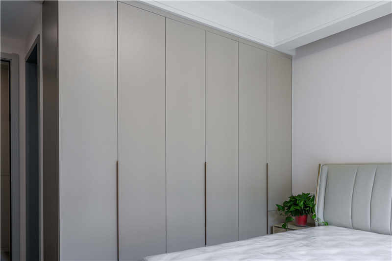 主臥室作為屋主的休息區(qū),整體更強調收納性和舒適度,采用茶白的色彩與全屋白色系更適配,一門到頂?shù)恼乓鹿癫捎玫氖且蛔中屯w拉手,方便使用。