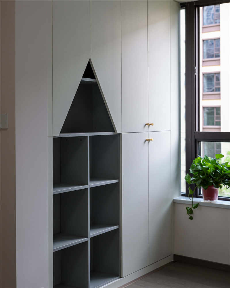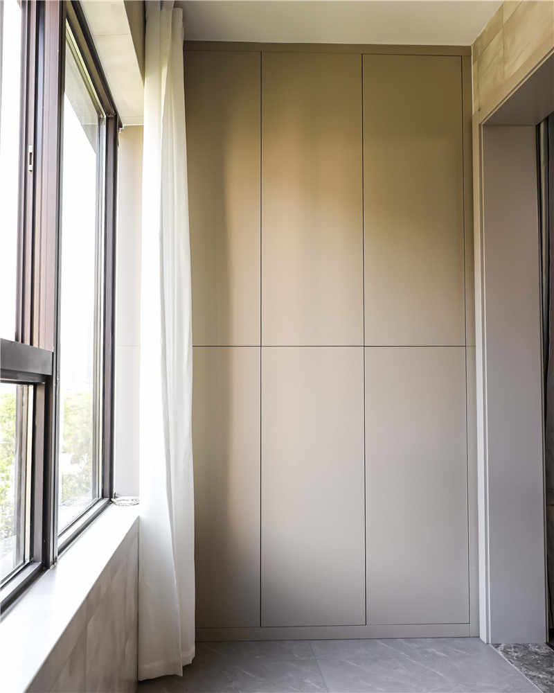 陽臺與客廳不做隔斷,在兩側分別定制了到頂?shù)恼骊柵_柜,外表簡樸低調,實則內涵欠款,不同尺寸的收納格可以用于收納衛(wèi)生物品和日常清潔的工具,很實用!