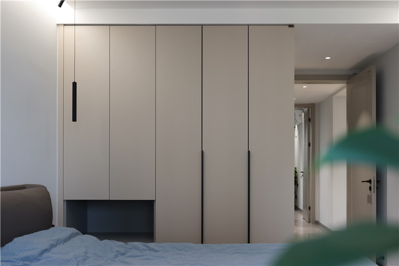 主臥采用無主燈設(shè)計(jì),內(nèi)嵌燈光與射燈營造空間氛圍感;靠窗邊做了一個(gè)嵌入柜,不占地方還分散了室內(nèi)的存儲壓力。