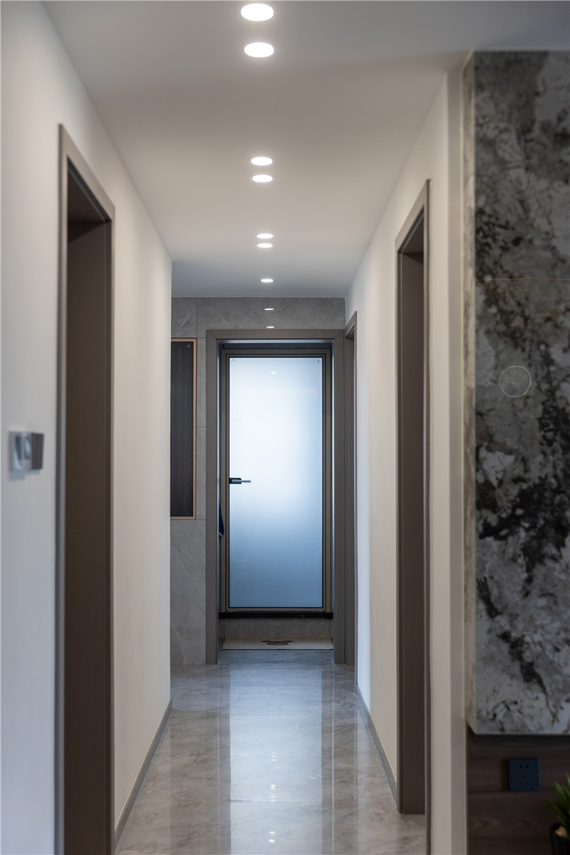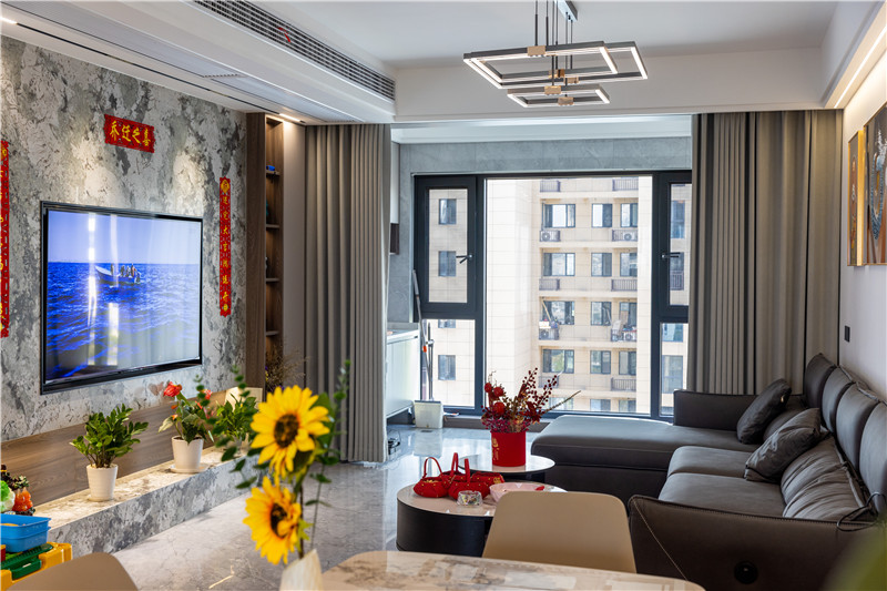 客廳整個(gè)打通后進(jìn)行地磚通鋪,延伸了空間視覺感,在客廳的空間設(shè)計(jì)上以簡繁結(jié)合的方式,在電視柜背景墻上,以大理石石材進(jìn)行裝飾,為全屋帶去更多的冷感。