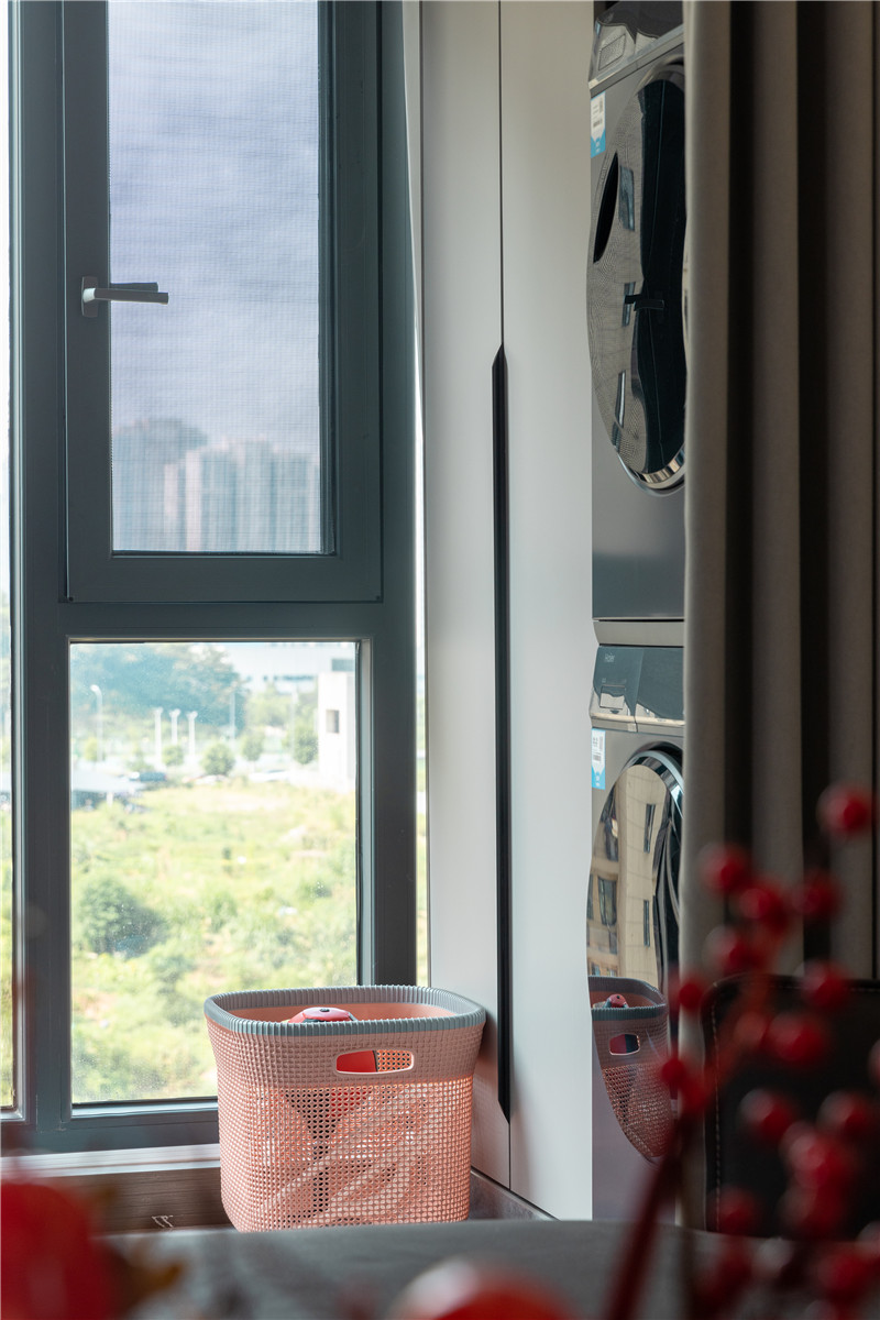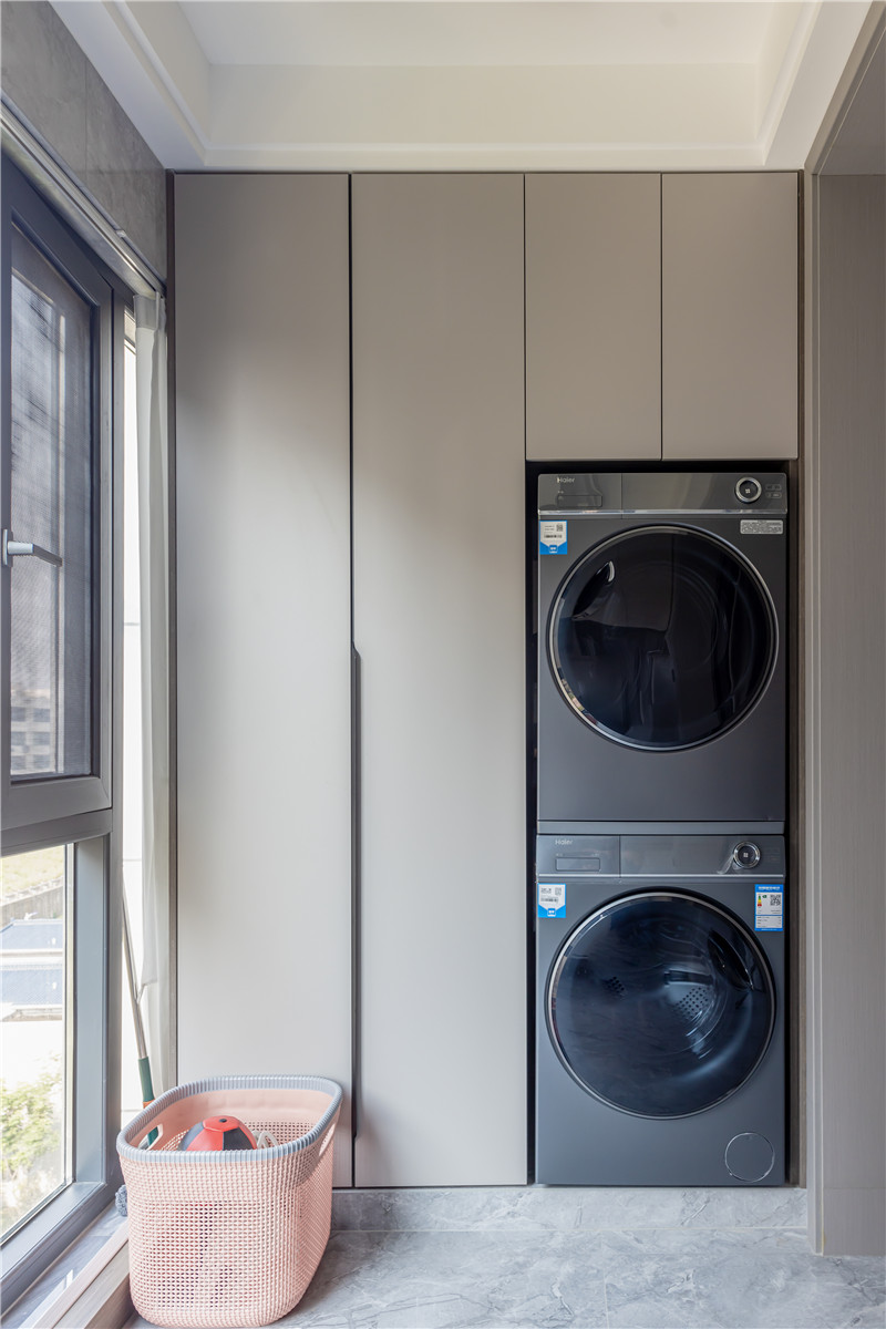 在這戶案例中,收納需求和居住的舒適性是屋主所追求的。所以在陽臺空間上,屋主與設(shè)計(jì)師也通過兩組柜子讓家變得更干凈。一側(cè)做家政柜嵌入洗烘家電,到頂高柜內(nèi)部分區(qū)合理,很實(shí)用。