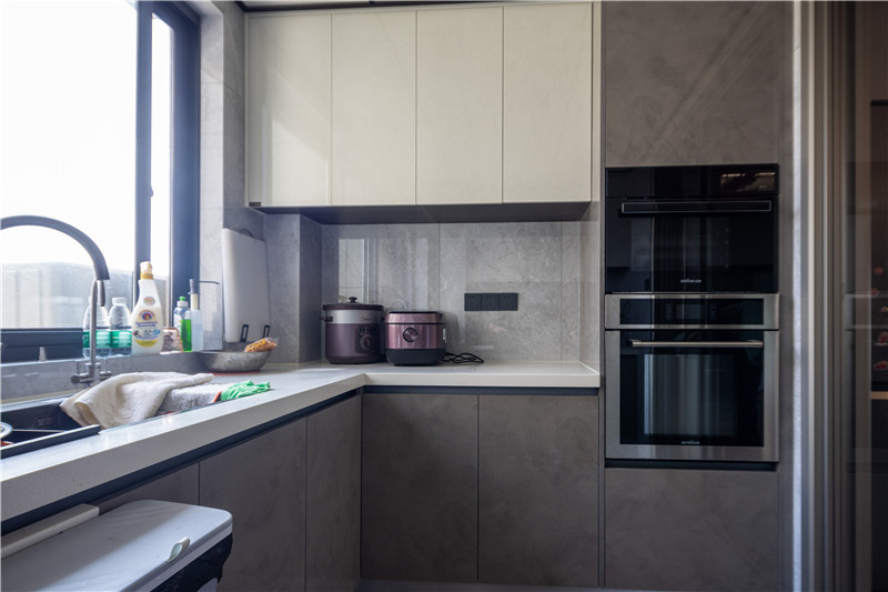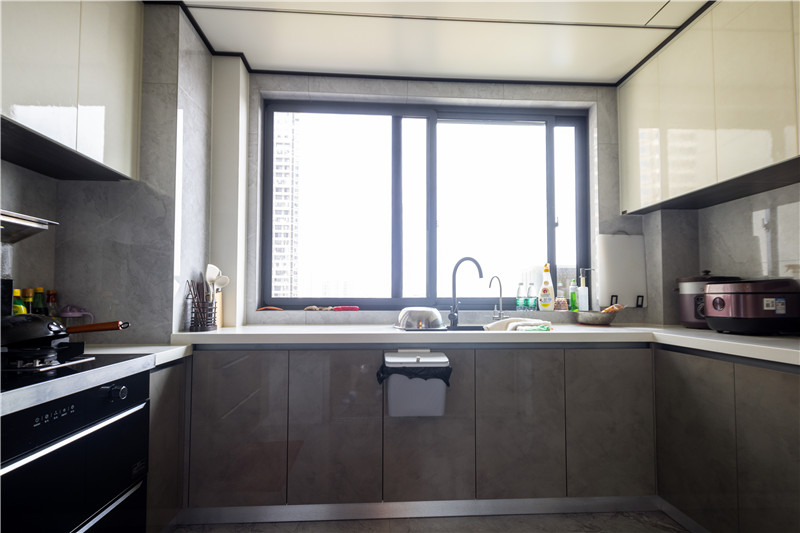 U型結(jié)構(gòu)的廚房設(shè)計(jì)更注重物品的收納,這種常規(guī)的吊柜+地柜的多重儲物空間,正是能促成有序整潔的環(huán)境。吊柜采用伊麗莎白,亮面材質(zhì)也很容易清潔。