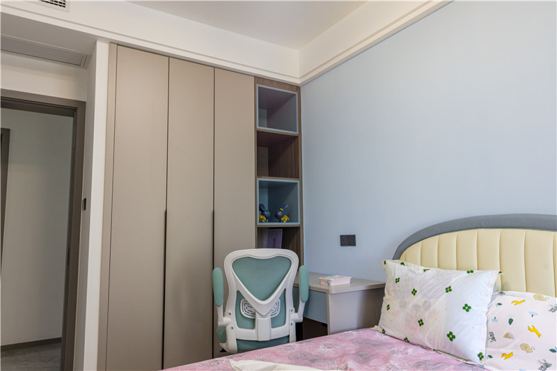 在女兒房的設(shè)計(jì)上,屋主以粉色調(diào)和藍(lán)色調(diào)塑造了兩間次臥。在次臥中,除了日常生活的睡眠區(qū),在衣柜設(shè)計(jì)中加入了書桌的元素,讓衣柜與書桌一體化設(shè)計(jì),開放格可做書柜使用,整體和諧又節(jié)省空間。