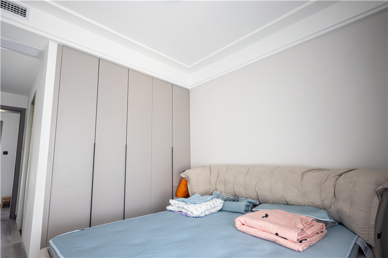 屋主根據(jù)居住者的需求不同,在每個(gè)房間的設(shè)計(jì)上都有所不同。主臥主要以睡眠區(qū)為主,在靠墻的位置設(shè)計(jì)了到頂衣柜,用于收納日常的衣物,整體非常簡潔。