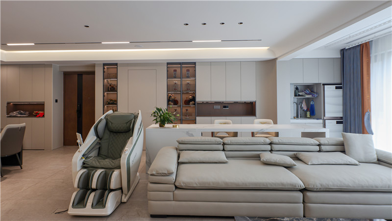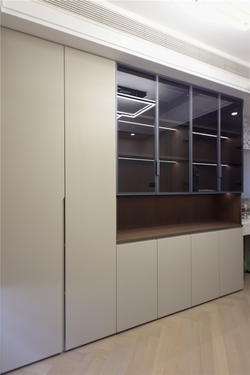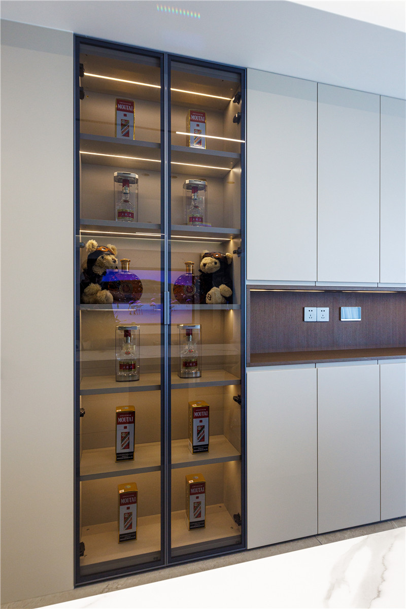 在沙發(fā)背景一側(cè),我們用一組島臺(tái)與餐桌的設(shè)計(jì)形成空間上的劃分,沿著墻壁走勢(shì)設(shè)計(jì)的酒柜與次臥門齊平,這樣整體做嵌入式的柜體收納會(huì)讓空間顯得更輕盈。半透茶色玻璃柜門也很好地展示了藏酒與工藝品,彰顯屋主的生活格調(diào)。