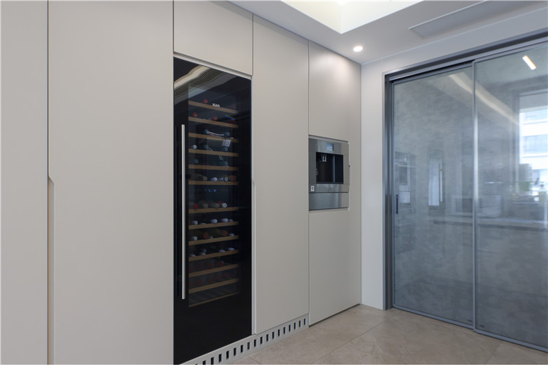 靠墻做整面餐邊柜,將冰箱嵌入其中,隱藏式設(shè)計(jì)更美觀。無(wú)把手的整面高柜給人簡(jiǎn)潔視覺(jué)體驗(yàn),不管是銑型拉手的細(xì)節(jié)還是板材的接縫處,都將工藝做到盡善盡美。