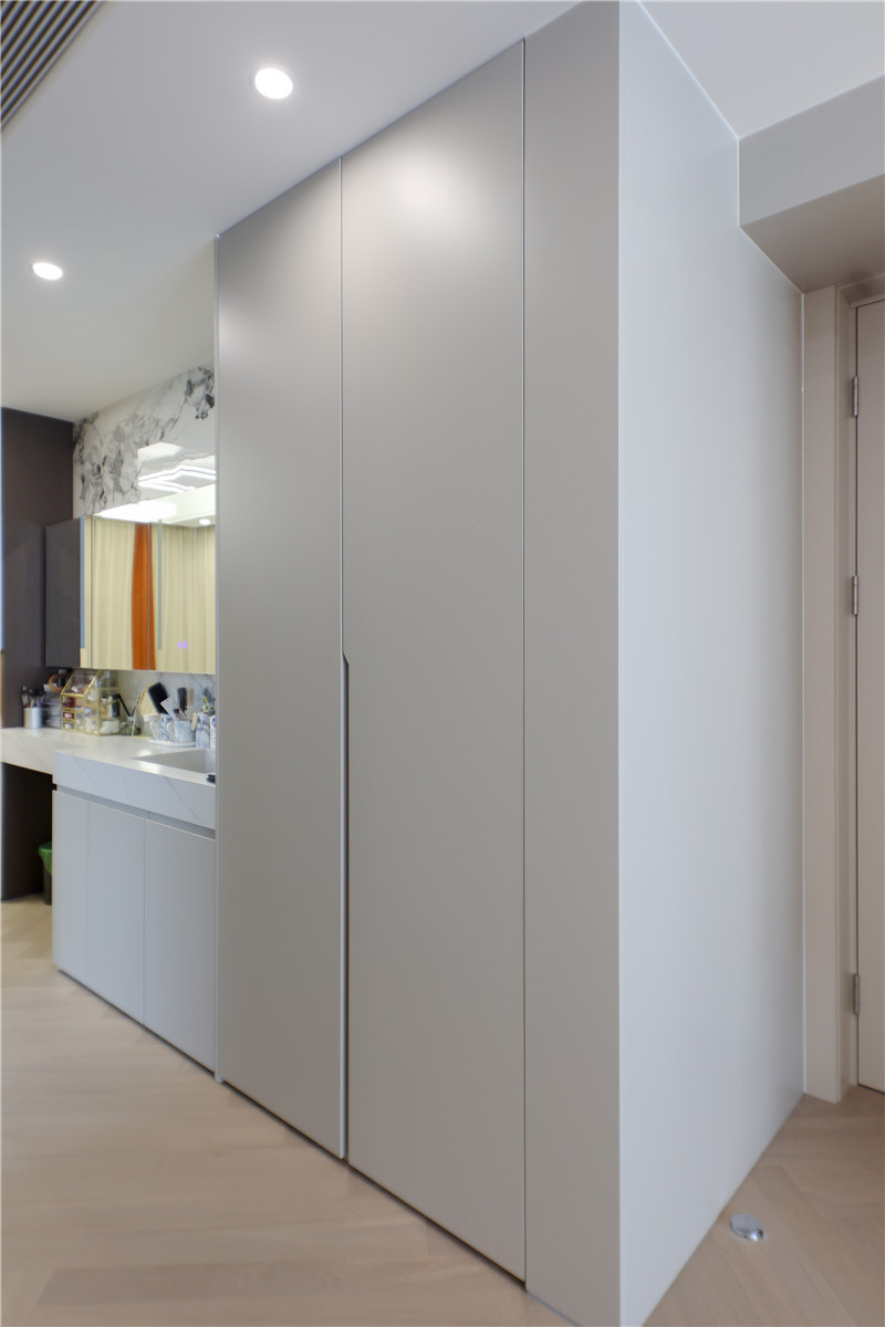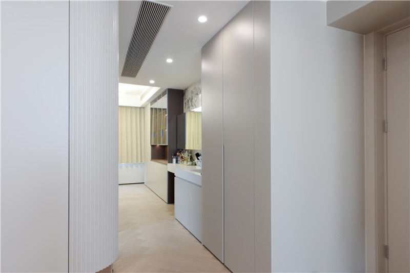 推開(kāi)與餐邊柜相連的門即進(jìn)入主臥空間,打通了衛(wèi)生間和衣帽間的設(shè)計(jì)讓主臥變身功能性十足的高品質(zhì)臥房。