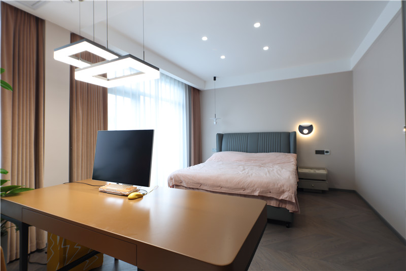 主人房:遵循主人喜愛的對稱設計,包含床頭柜、床頭燈、沙發(fā)等,干凈利落;整體色調不搶眼卻彰顯韻味;隱形推拉門的運用,視覺平和。