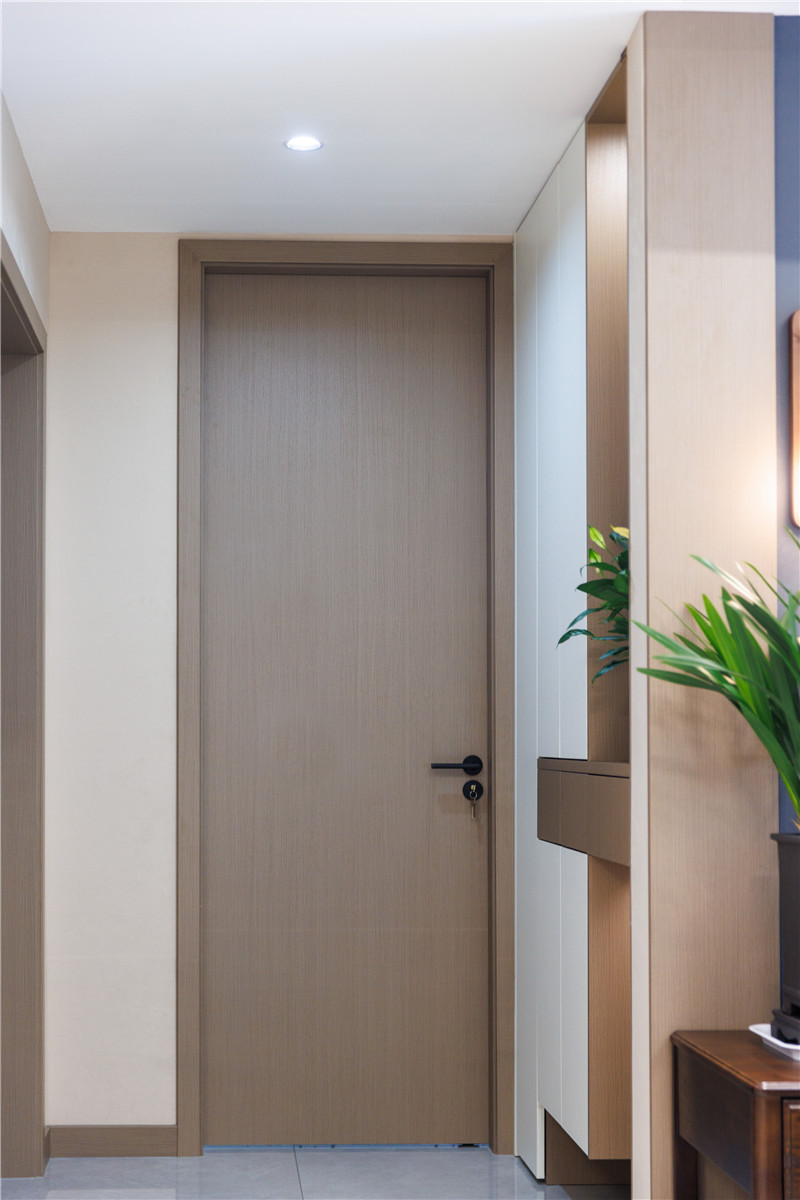 玄關(guān)柜設(shè)計(jì)遵從簡單設(shè)計(jì)手法,選用科技直紋與蘭迪白作拼色設(shè)計(jì)增添時(shí)尚感,讓空間不單調(diào);門墻柜一體化選用客來福科技直紋,更加自然百搭。