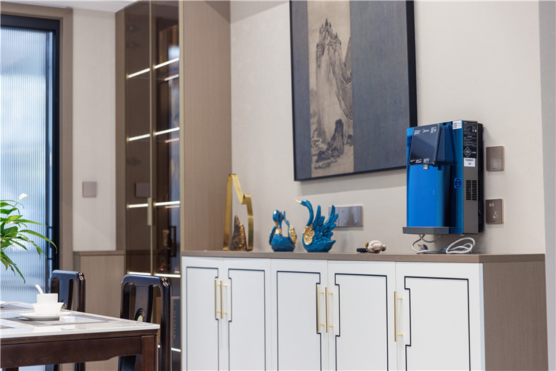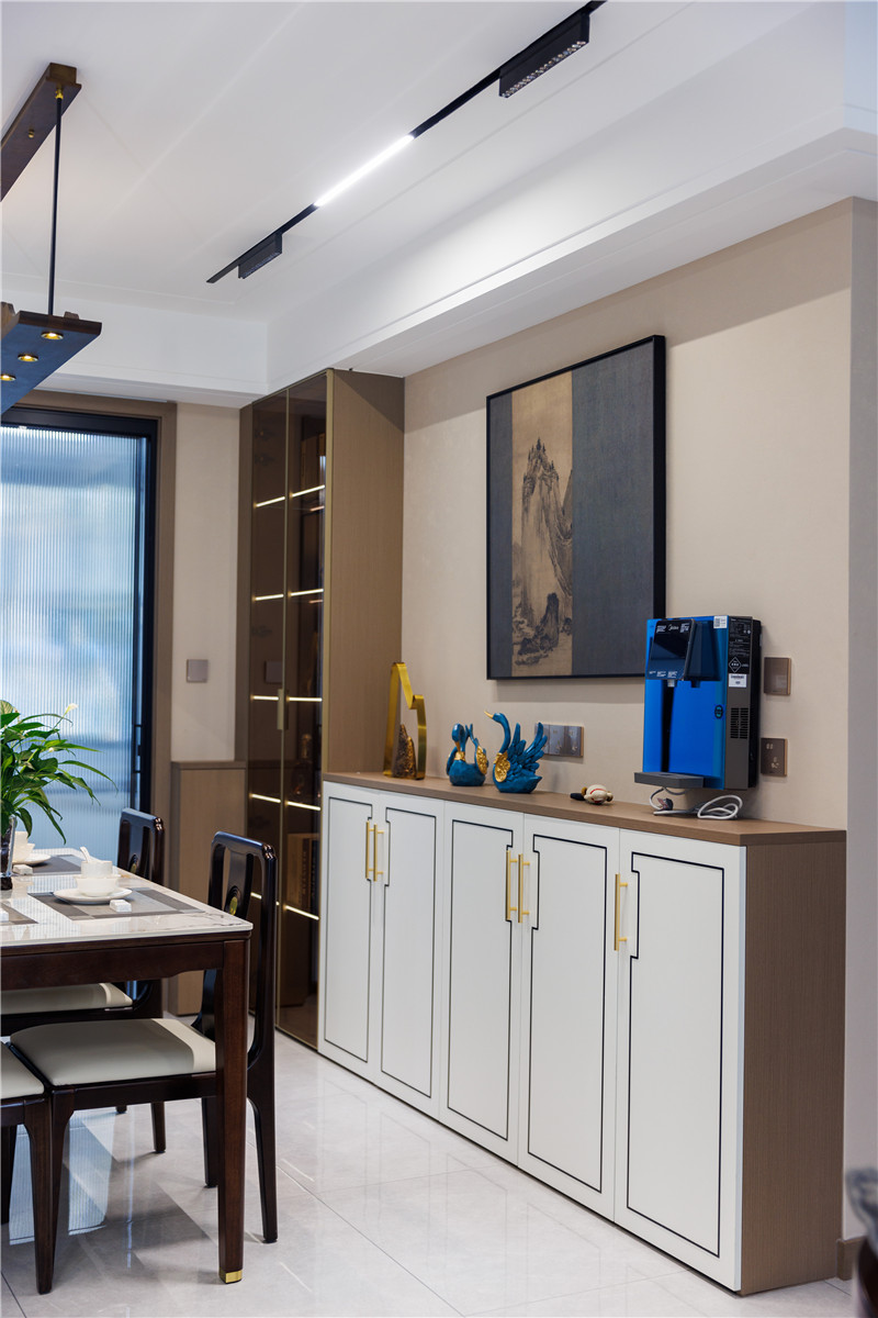 餐邊柜設(shè)計(jì)選用了矮柜+2組玻璃高柜,矮柜具有濃烈的中式風(fēng)格,黑色方形刻線+金色拉手,既大方美觀又簡單高雅;玻璃高柜的選用,為餐廳增添一絲奢華氛圍。