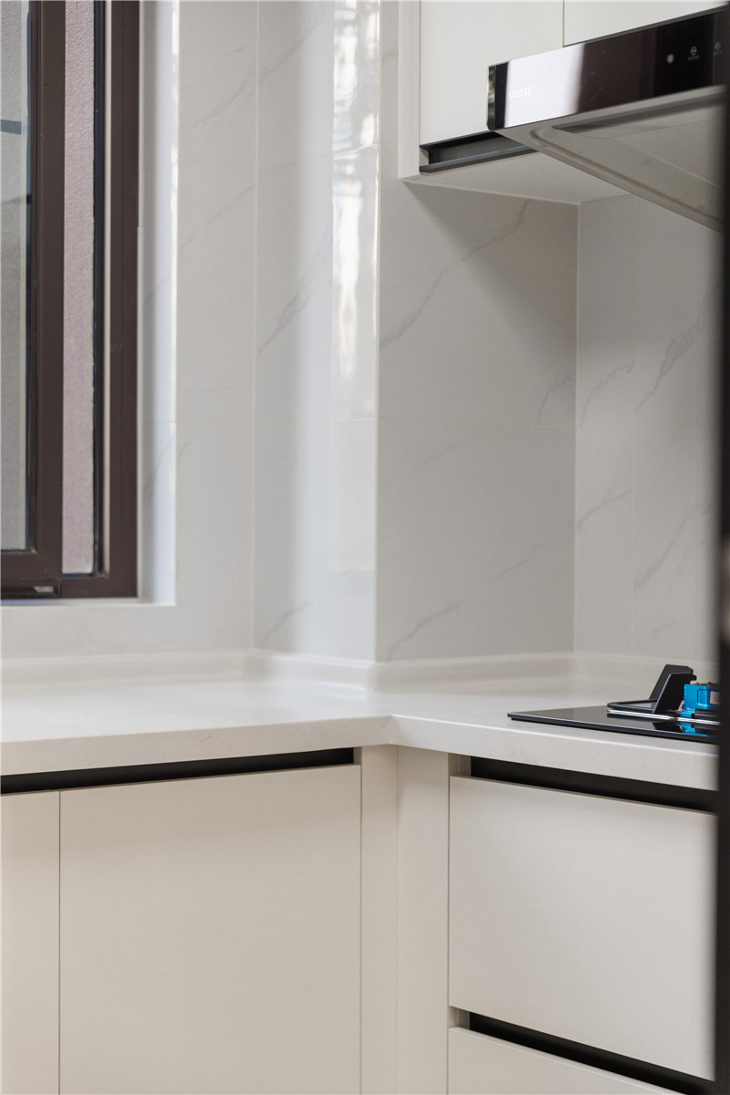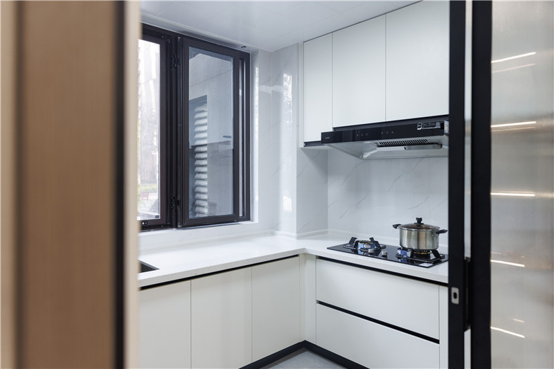 廚房面積有限,選用U型櫥柜設(shè)計(jì)合理的運(yùn)用空間,蘭迪白與免拉手設(shè)計(jì),使得空間簡潔干凈,符合廚房應(yīng)有的基調(diào)。