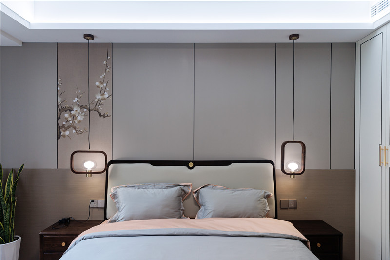 主臥延續(xù)了餐邊柜的配色設(shè)計(jì),蘭迪白與科技直紋的恰到好處融合,充分發(fā)揮新中式的淡雅魅力。