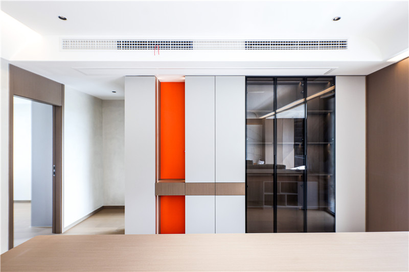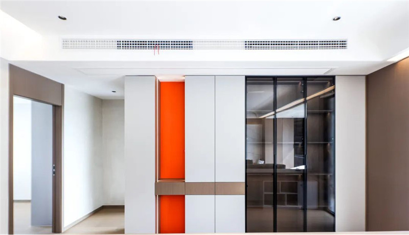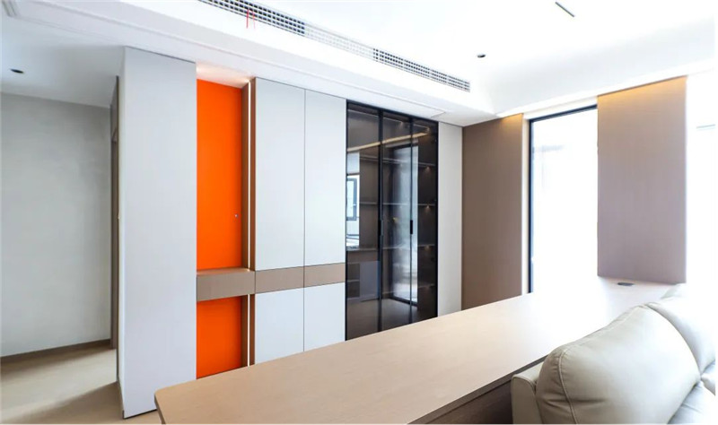 收納柜設(shè)計簡約時尚,一柜到頂設(shè)計增加收納能力,玻璃柜與蘭迪米灰拼接,盡顯輕奢氛圍。