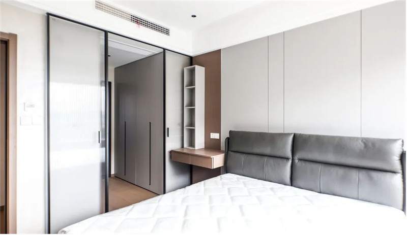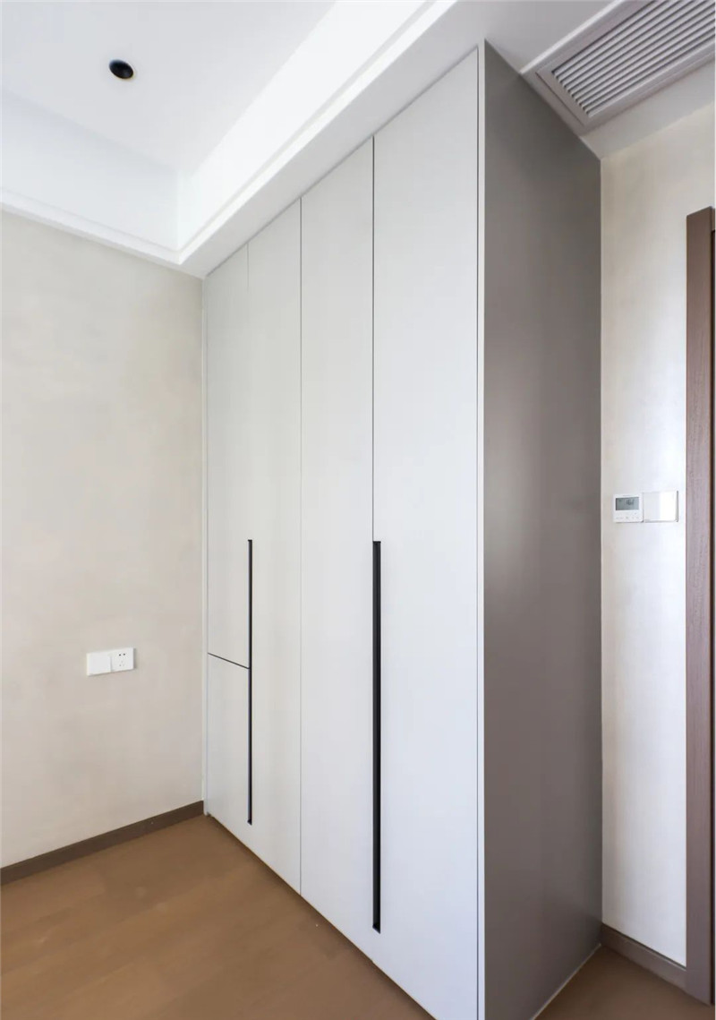 衣柜配色選用的蘭迪米灰與科技直紋,配色簡單時尚;一柜到頂式設(shè)計更加實用美觀;一字型長條拉手,符合簡約風(fēng)從簡基調(diào),整體視覺效果美觀大方。
