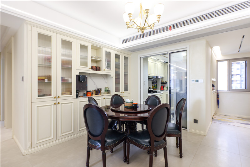 餐廚空間以推拉門做區(qū)隔,減輕油煙困擾;圓弧形配套餐桌,柔和之美下是高安全系數(shù);一字型餐邊柜,中部掏空預留來放水杯、飲水器等,存儲能力強。