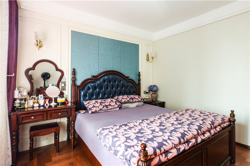 主臥:復古美式的雅致,是主臥空間傳達給人的韻味。床頭背景墻采用藍調(diào),形成拼色;床頭兩側(cè)古典樣式小吊燈,時尚奢華;一側(cè)床頭柜升級為梳妝臺,高級精致。