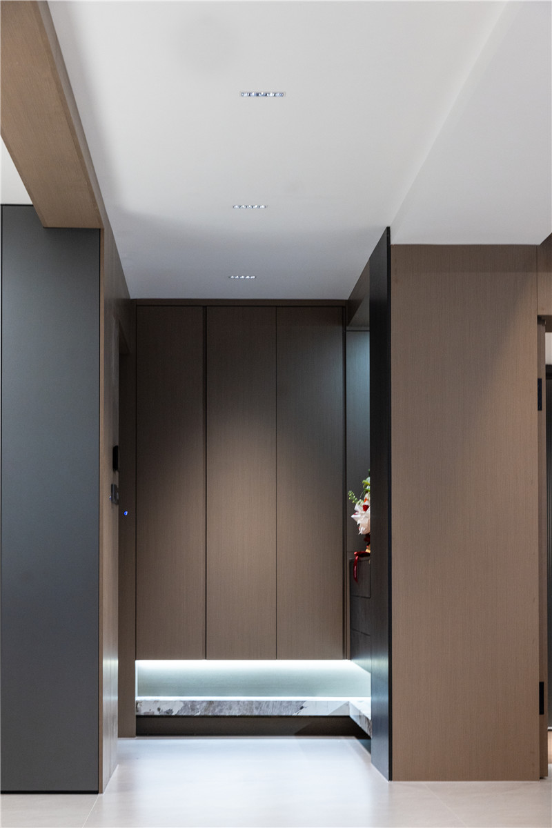 入門玄關(guān)整體L型構(gòu)造,其懸浮掏空設(shè)計(jì),顯大且具深度;玄關(guān)造型采用內(nèi)退手法,借用臥室空間來做DIY放置區(qū);將條帶燈光嵌入內(nèi)退區(qū)拐角,明亮通透。