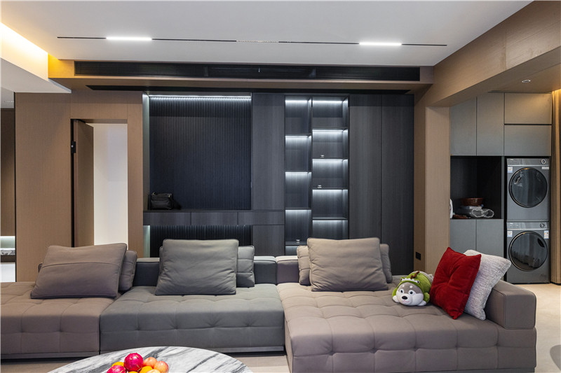 沙發(fā)背景墻為家里的動(dòng)線區(qū),立柜+穿插設(shè)計(jì)貼墻而立,好看且頗顯趣味。