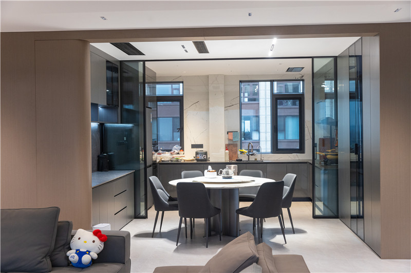 餐廚半開放式構(gòu)造,以推拉門做隔斷,兼顧美學(xué)與實(shí)用性。