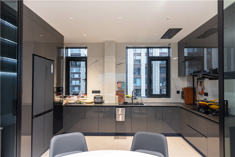 柜體以無拉手配合銑槽拉手,平整簡約;一側(cè)柜體內(nèi)嵌烤箱、冰箱等電器,存儲(chǔ)力UP!櫥柜采用亮面門板、臺(tái)面為巖板,防水耐污能力強(qiáng)。