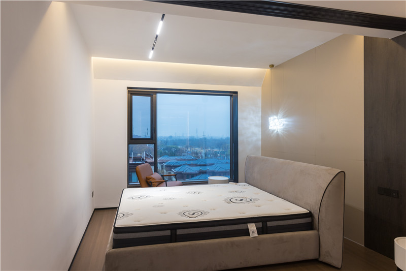 主臥床頭背景墻采用拼接設(shè)計(jì),藝術(shù)燈光做點(diǎn)綴,營造出簡約純粹感;靠窗吊頂為斜坡設(shè)計(jì),視覺上拔高層高。