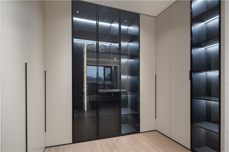 室內(nèi)以夢(mèng)幻玻璃磚隔出一個(gè)衣帽間,梳妝臺(tái)依屋主需求定制高度,側(cè)邊U型立柜作為收納區(qū),展示區(qū)與私密區(qū)區(qū)分,符合人體工程學(xué)設(shè)計(jì)。