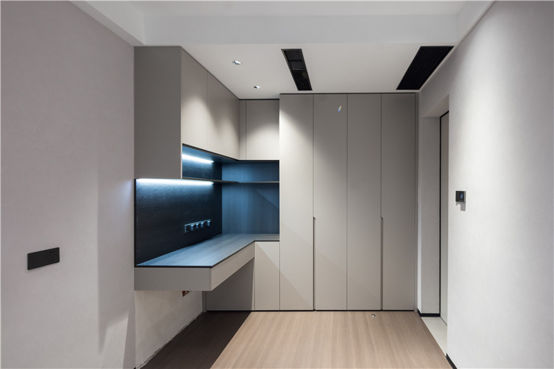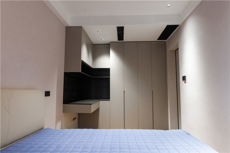 客臥兼書房使用,衣柜延伸為書桌,以懸挑設(shè)計(jì)突出特色。墻面采用了藝術(shù)漆,易擦拭,方便屋主整理清潔。
