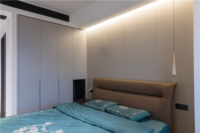 壁柜有效保障收納力、門板采用銑槽長拉手、柜體延伸為床頭柜,簡約實(shí)用;吊頂滿滿小心思,增強(qiáng)空間的光影感。