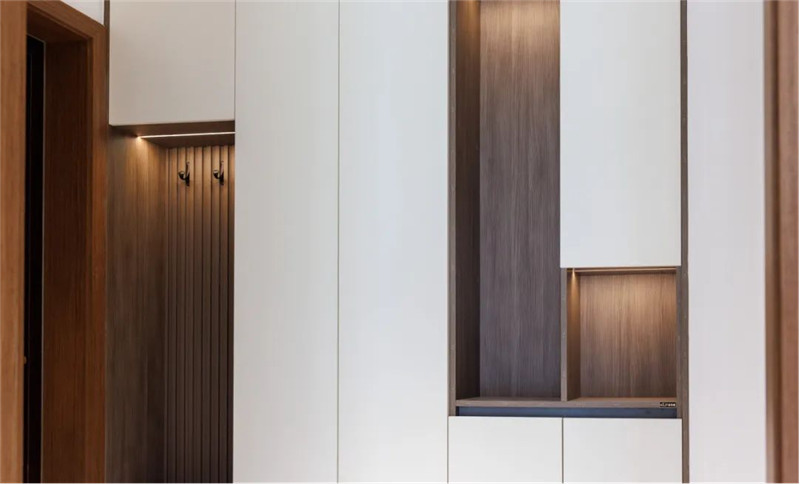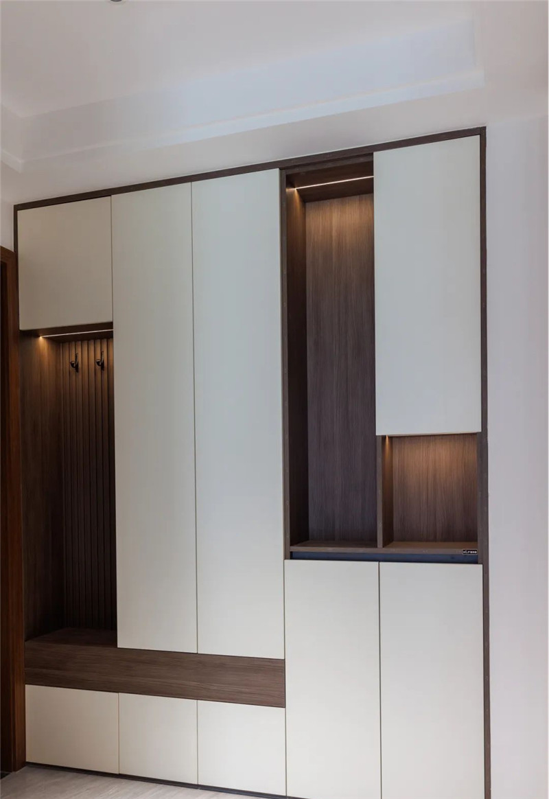 柜子設(shè)計(jì):玄關(guān)柜一柜到頂既滿足收納需求,頂部空間也不用再打掃;功能分區(qū):利用深色穿插設(shè)計(jì),將掛衣區(qū)與放鞋區(qū)隔開;封閉式與開放式掛衣、封閉式放鞋區(qū)更符合日常使用習(xí)慣。