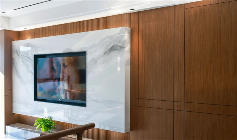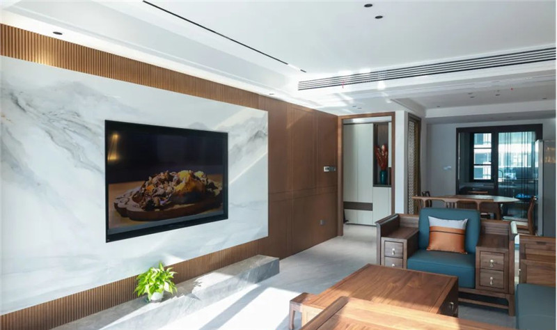 實(shí)木格柵、不規(guī)則拼接與懸浮山紋大理石構(gòu)建成電視背景墻,畫面觀感令人舒適,古色古香;背景墻內(nèi)含隱形門,巧妙的設(shè)計(jì)使空間顯大,和諧美觀。