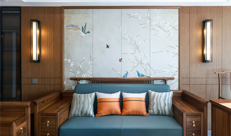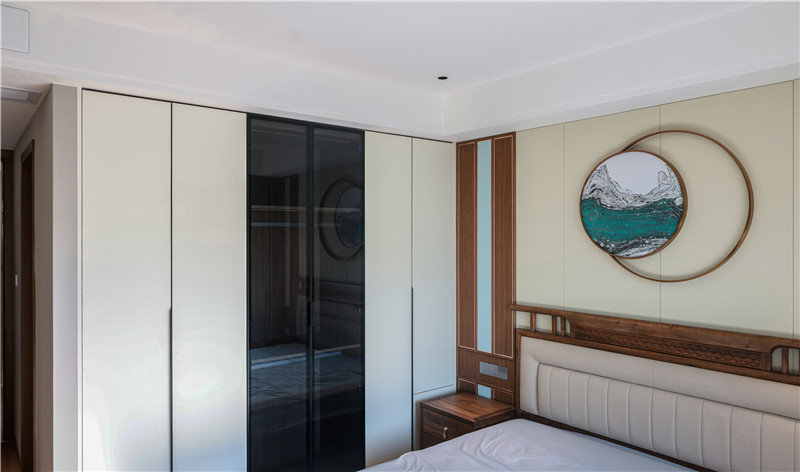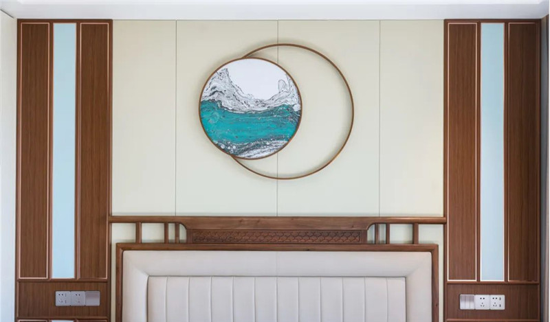 背景墻采用不規(guī)則拼接,實(shí)木與米白的配色經(jīng)典和諧。背景墻中遵循了中式美學(xué)對稱,簡中有序,整個(gè)臥室洋溢著新中式意境。