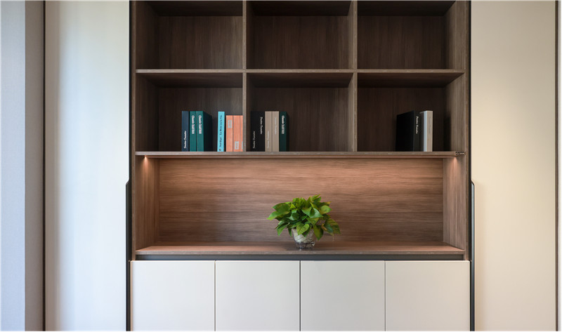書房書柜設(shè)置了更多開放區(qū),用來擺放書籍、藝術(shù)品、手辦等物品,方便拿放的同時(shí)也增加了柜子的顏值。