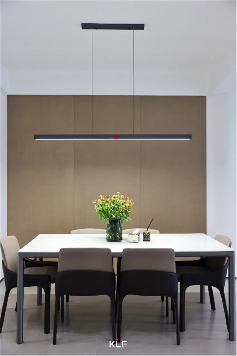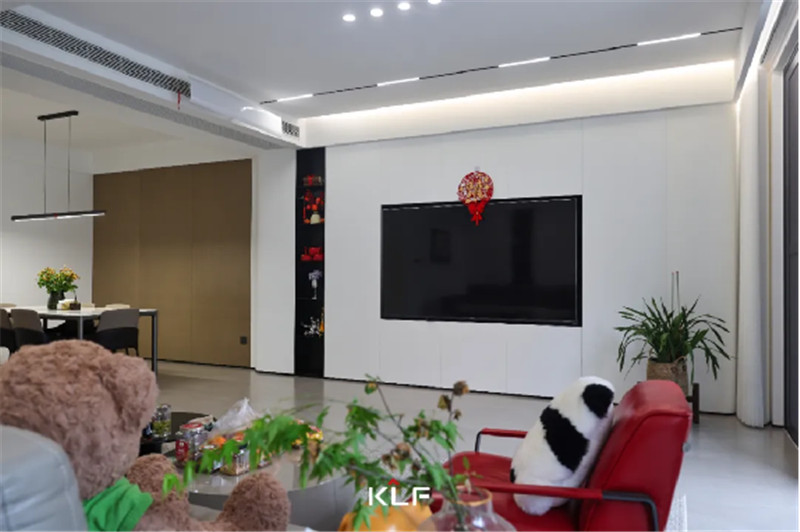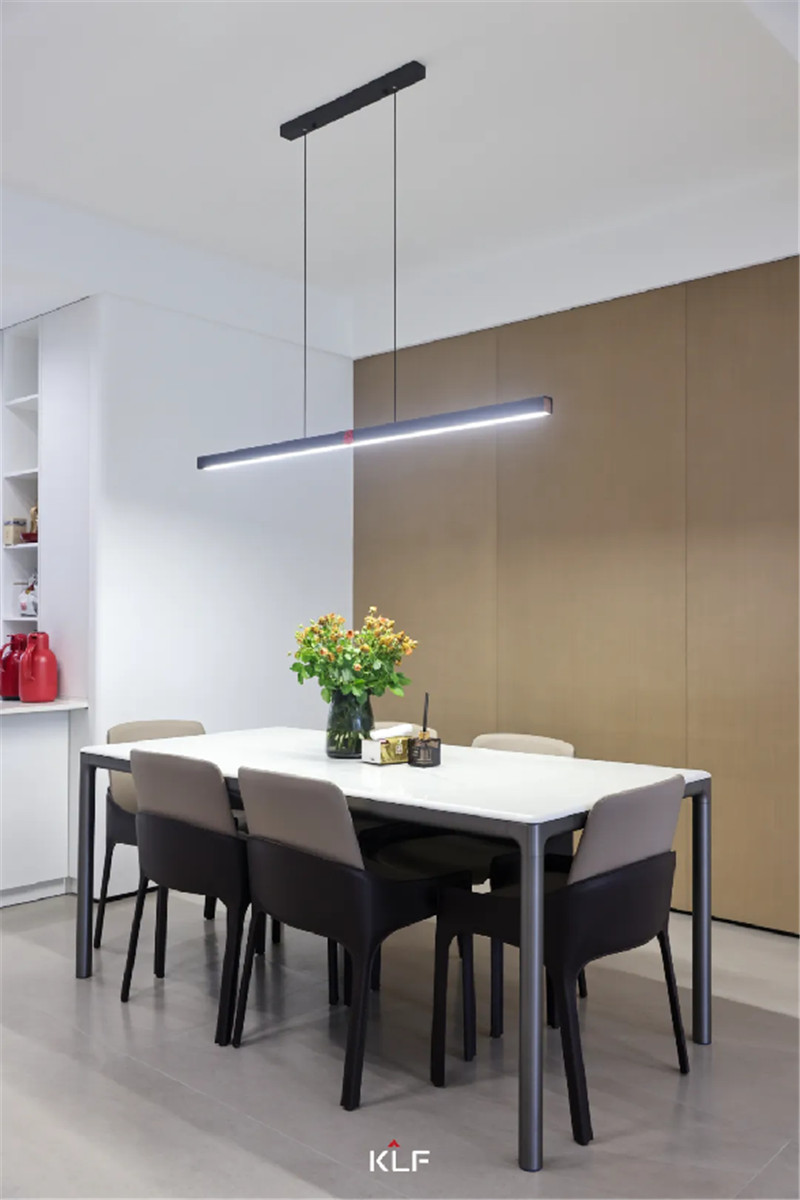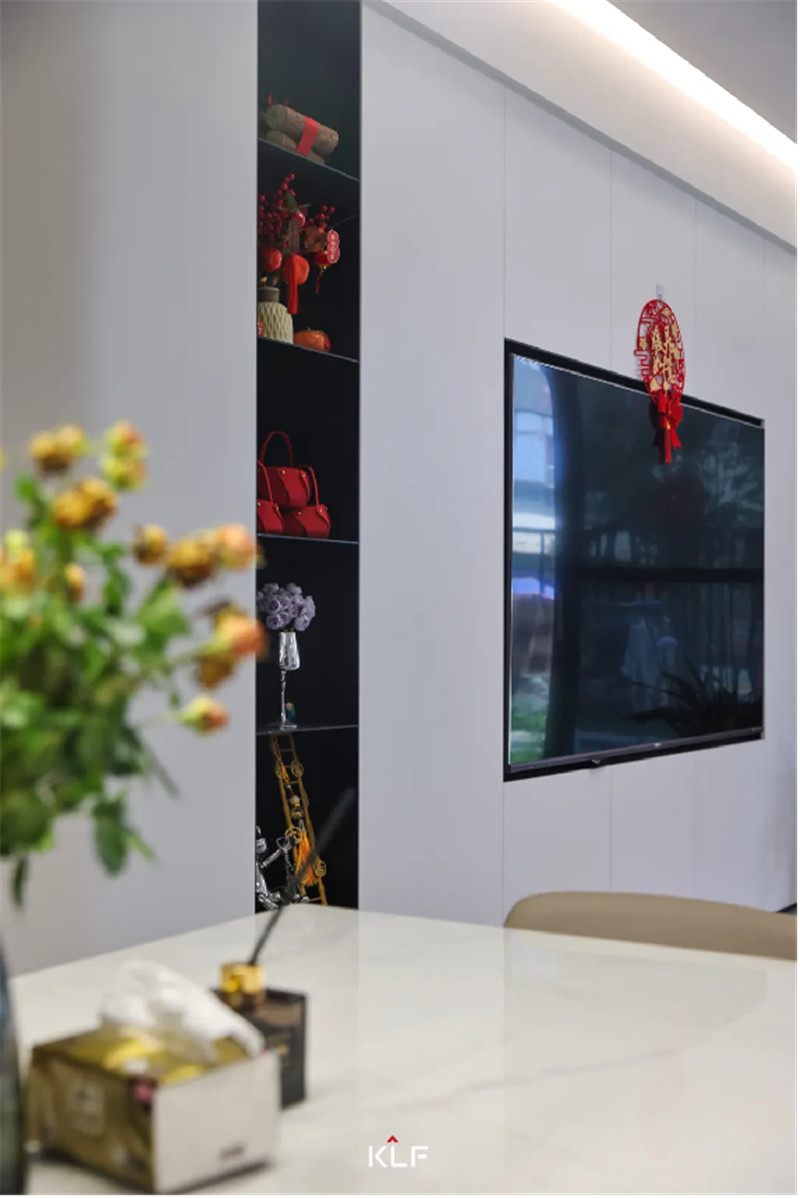 科技直紋背景墻與白色巖板餐桌的碰撞