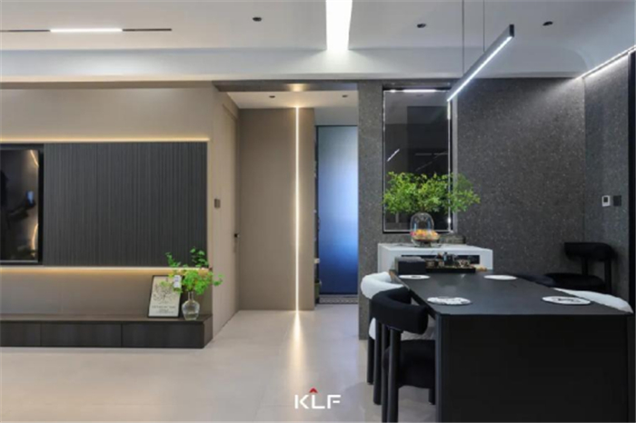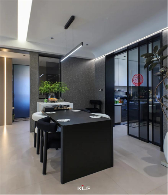 采用體塊穿插的形式,組成島臺餐桌一體的結(jié)構(gòu),提供了餐廚空間的聚餐和交流功能。承襲黑白碰撞的張力,用克制又低調(diào)的語言,傳遞場域的精神。布藝餐椅和木質(zhì)餐桌,搭配出新的視覺意趣。