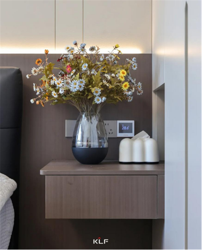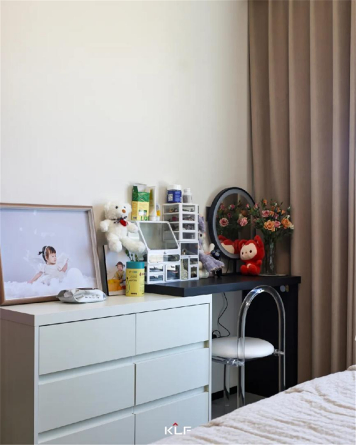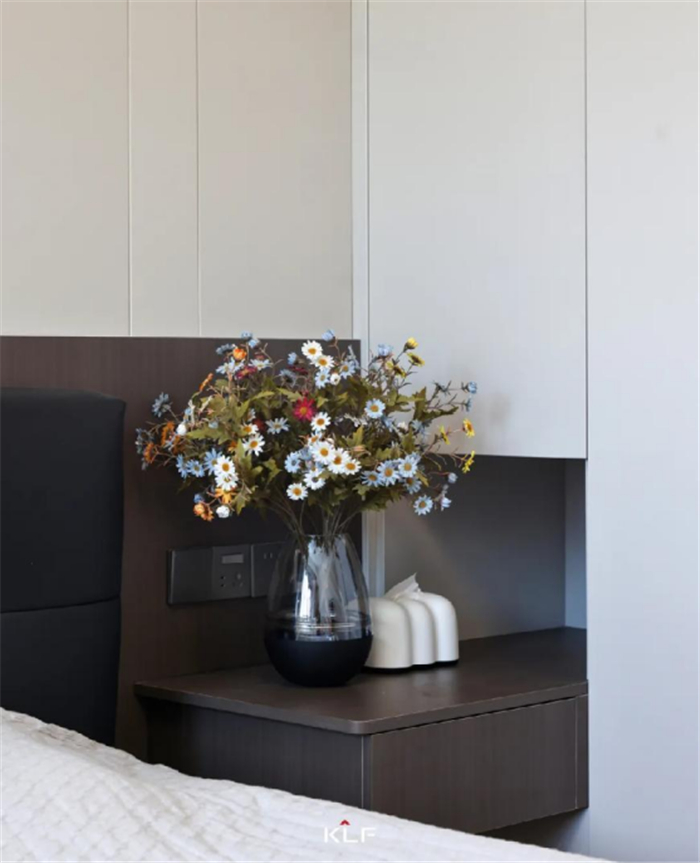 為了避免床尾滿墻柜帶來的壓抑,床尾巧妙設(shè)計了梳妝臺斗柜,簡潔實用。懸挑設(shè)計帶來輕盈的呼吸感,彰顯精致優(yōu)雅的生活儀式感。