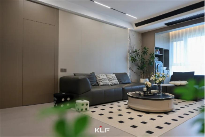 陽臺鏈接客廳,打造出會客與觀影、觀景并存的空間。大面積落地窗增加通透感,搭配無主燈設(shè)計,解鎖光的語言,光影藝術(shù)制造不容忽視的經(jīng)典韻味。