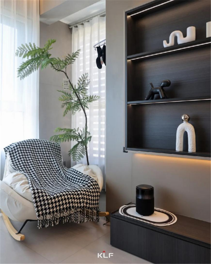 簡約線條勾勒天花,穩(wěn)重色塊占據(jù)墻地。素雅米白、深邃黑色與質(zhì)樸木色交融碰撞,樸實溫厚的氣息浸潤空間。