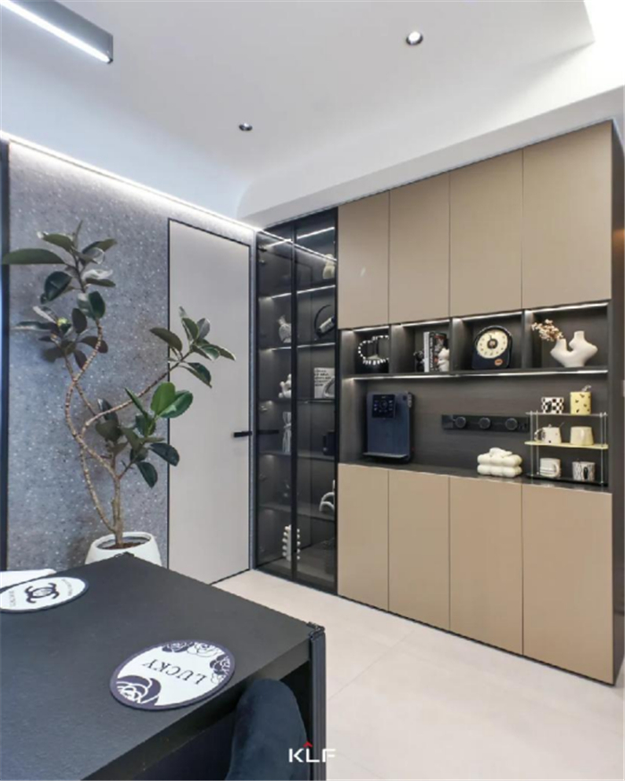 灰玻推拉門隔絕油煙,借玻璃通透特性自由連通,消弭了邊界感。材質(zhì)的細膩與其展示的簡約形態(tài),自然地將功能擴展、銜接,呈現(xiàn)出精致、純凈的生活儀式感。